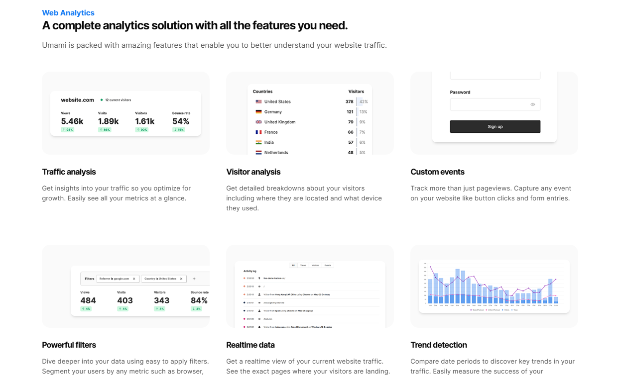 umami提供了多种数据统计功能,非常的直观,下面的umami官网列出的一些特性: