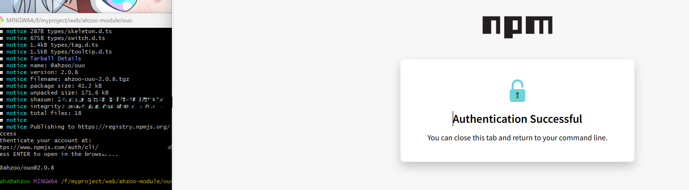 完成后重新执行npm publish推送,会让你进行双因素认证,认证完成后就可以成功推送: