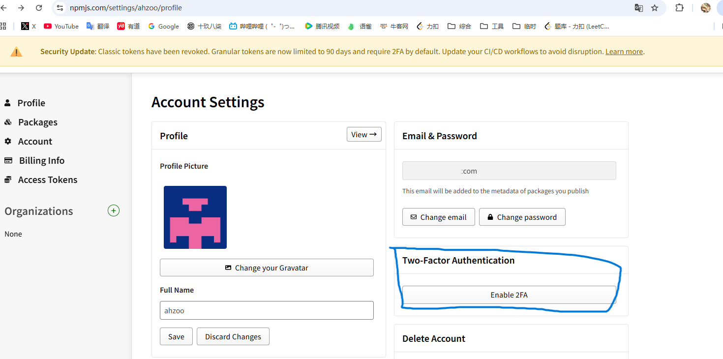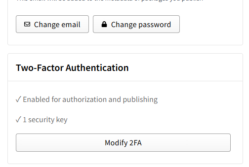 由于npm启用了新的验证规则,所以发布npm包时,必须使用双因素认证(2FA),已启用2FA的账号,发布时需输入动态验证码。