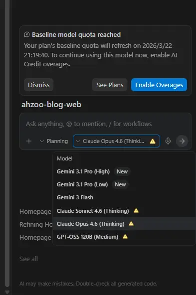 而我用的是谷歌的反重力编译器,一般我会先使用claude opus4.6模型,但是这个模式token消耗量实在是太快了,往往一个还没生成一个令我满意的界面,token就耗完了,gemini模型token额度会稍微多一点,但是也并不够用,往往两天时间我就把一周的token量用完了。